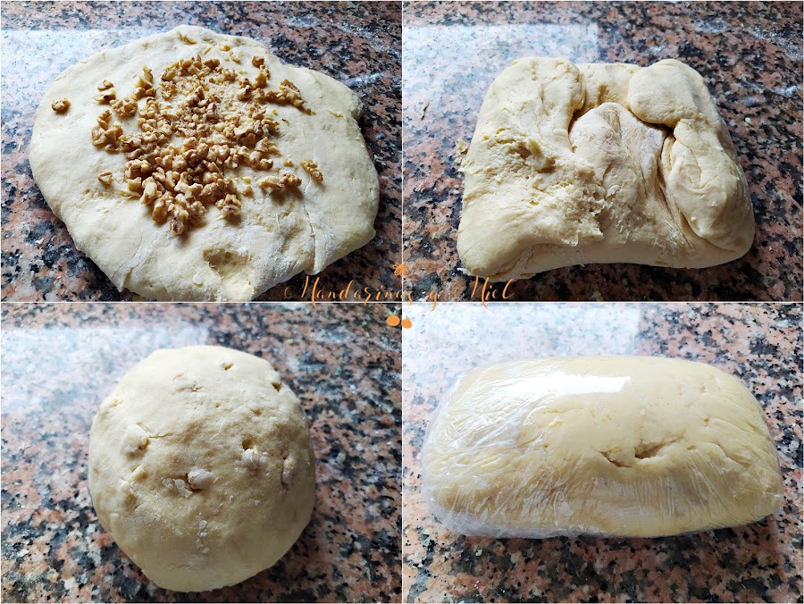 Mezcla con cuidado y dobla la masa para que se integren bien las nueces, forma una bola y dale unas vueltas.