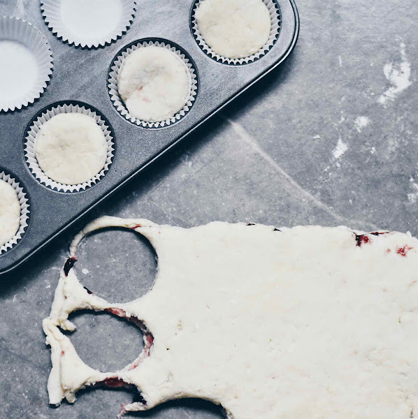Tengo que decirles que esta receta la hice dos veces. La primera vez con todos las orillas de masa que me quedaron, las uní y hice más scones en una charola. Pero los scones principales que son los que hice en el molde de cupcakes me quedaron muy pequeños. No se miraban muy bonitos, de hecho se miraban mejor los que hice con la masa restante. Así que hice de nuevo la receta y la masa que me sobro la puse por debajo de los discos de masa o "sandwiches". ¡Quedaron excelentes esta vez!