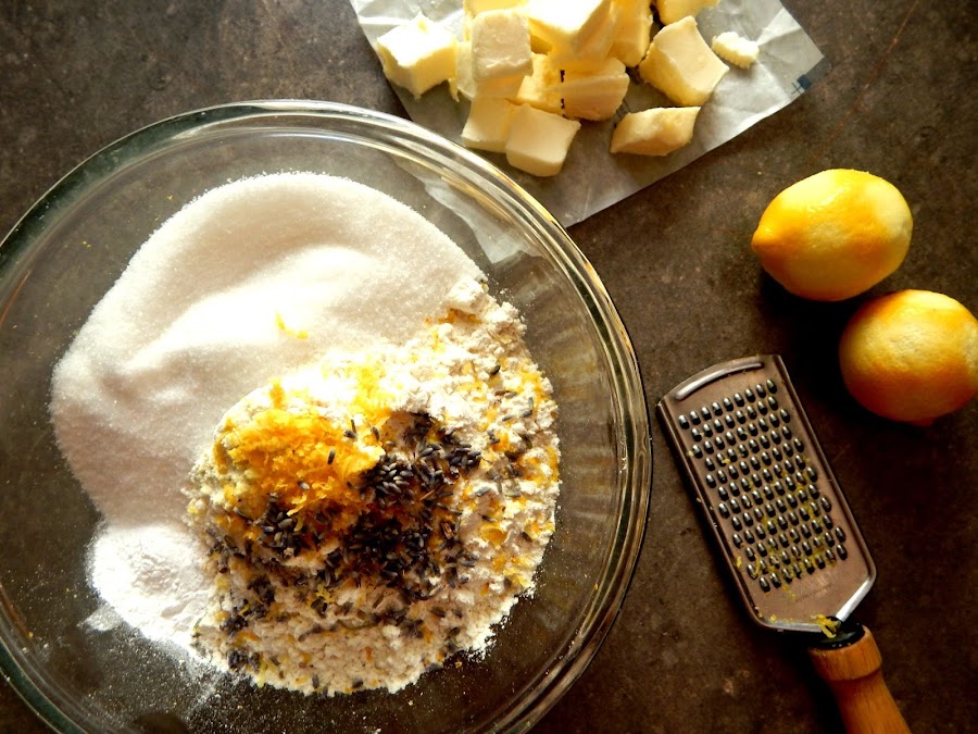 En un bowl combinamos nuestra harina, azúcar, polvo de hornear, sal, ralladura de limón y lavanda.