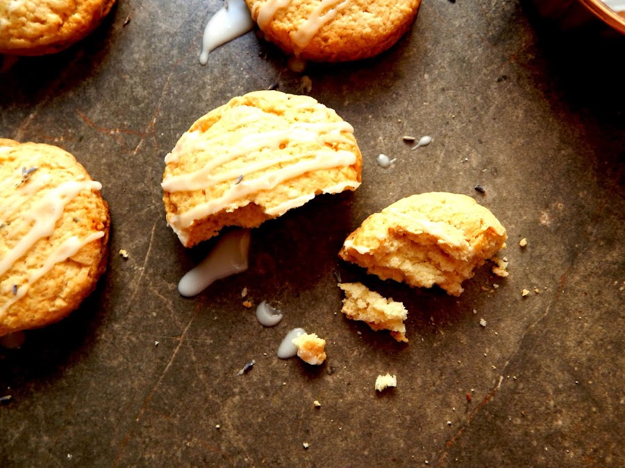 Si el azúcar glass tiene grupos es preferible cernir antes de usar. Mezclamos el azúcar glass con el jugo de limón. Glaseamos los scones y ponemos más flores de lavanda por encima.