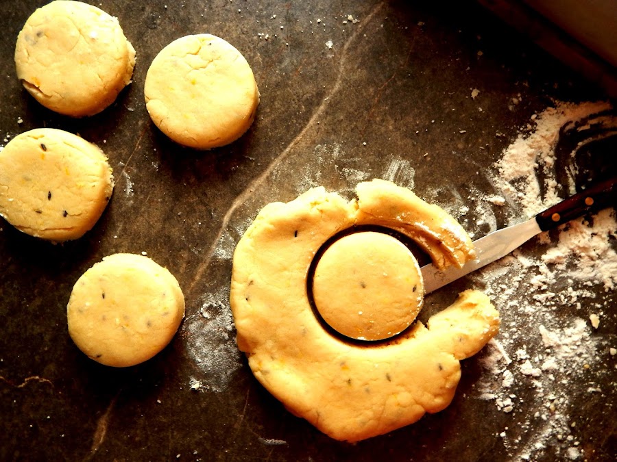 Espolvoreamos un poco de harina en nuestra mesa de trabajo. Estiramos la masa con un rodillo dando un grosor de 2 cm. Usamos un cortador de 7 cm de diámetro (enharinamos el cortador para que no se pegue a la masa) y cortamos. Unimos las orillas de masa sobrantes, tratando de no sobre-trabajarla, hasta obtener 8 scones.