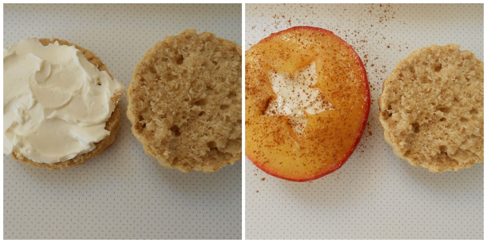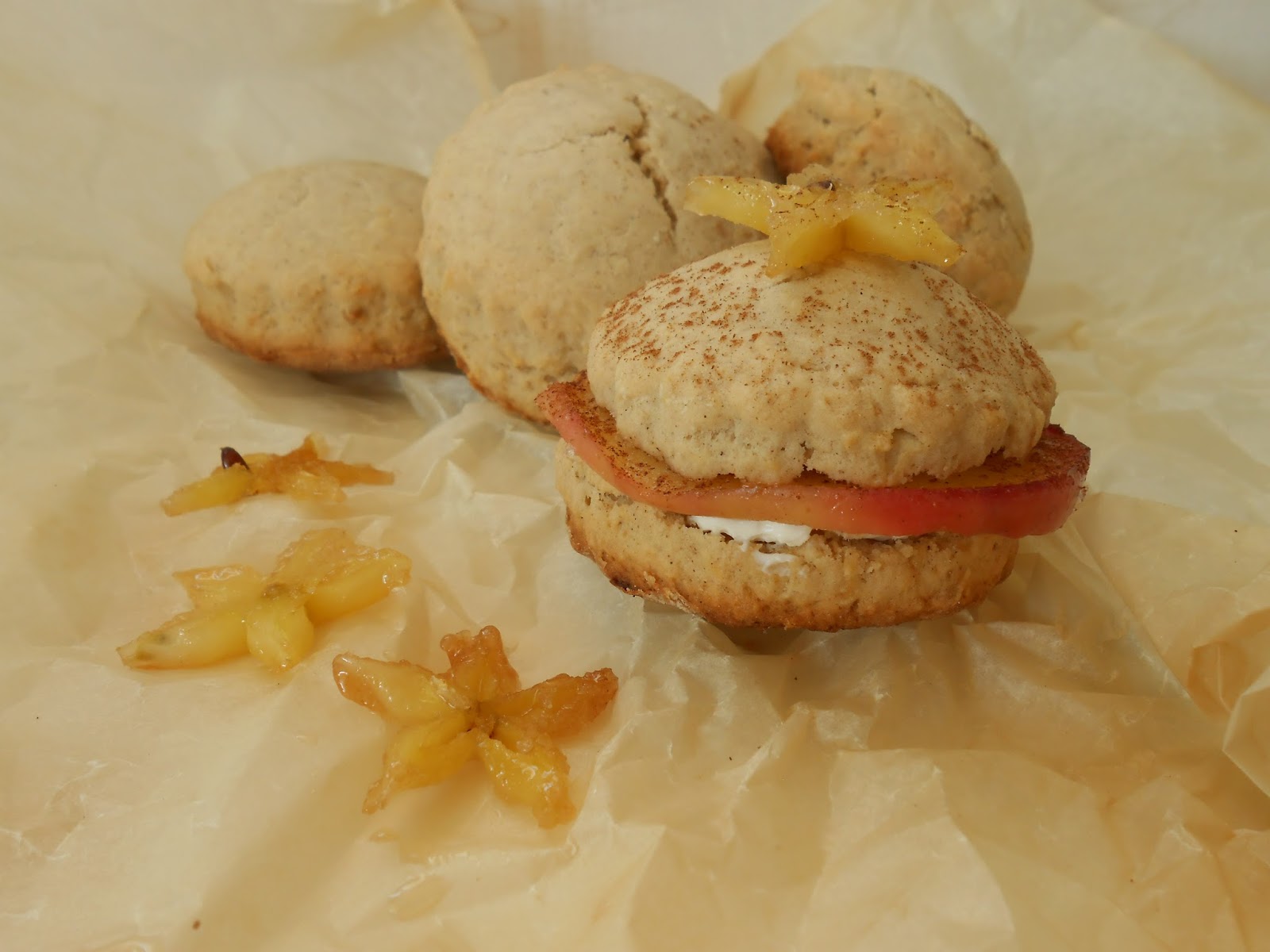 Abrir un scone por la mitad, untar con queso tipo Philadelphia , colocar una rodaja de manzana cocida, espolvorear con canela en polvo y cubrir con la otra mitad de scone, decorar con la flor de manzana, et voilá.