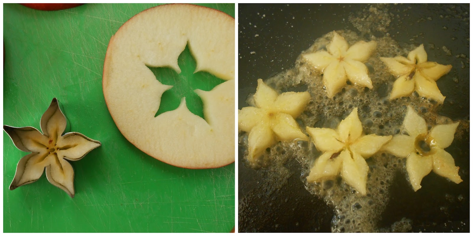 Mientras se cocinan cortar una manzana en rodajas, cortar flores con un cortante y cocinar en una sartén con mantequilla y azúcar, hasta que se doren.