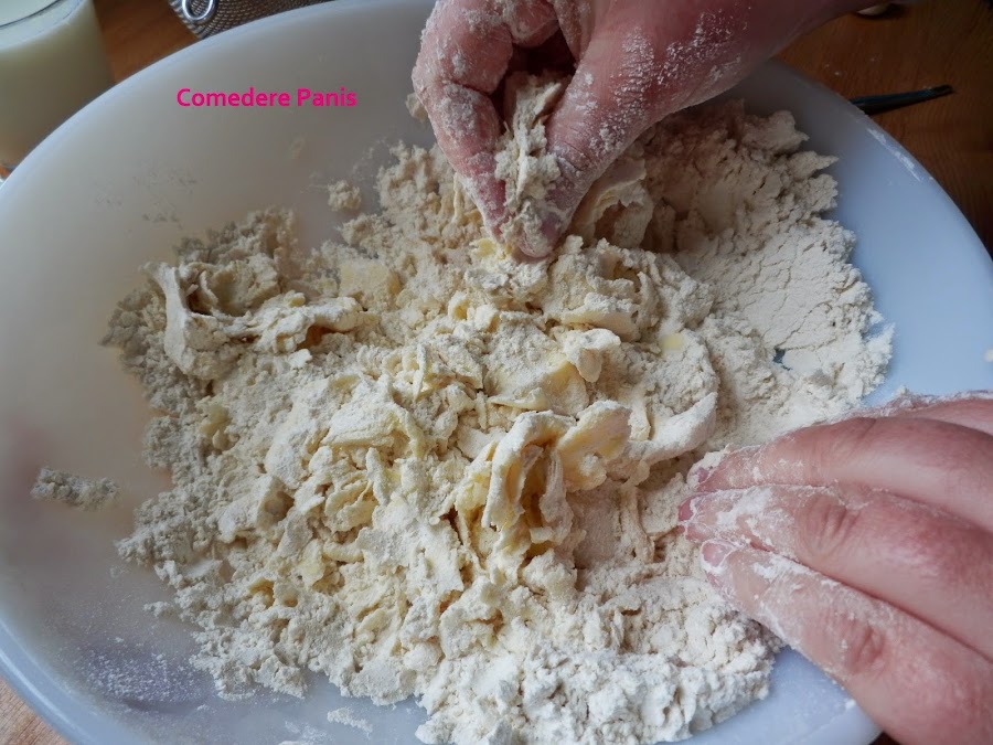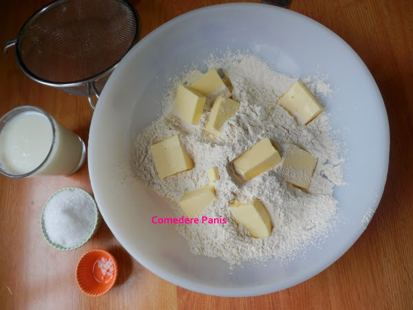 Añade la mantequilla a la harina y comienza a desmenuzarla, pellizcando la mantequilla hasta que se integre con la harina y tenga apariencia migas de pan, aunque a mi me recuerda a la arena mojada de la playa. ¡Uff que ganas de ir a la playa!