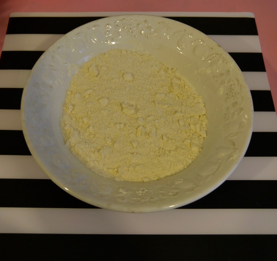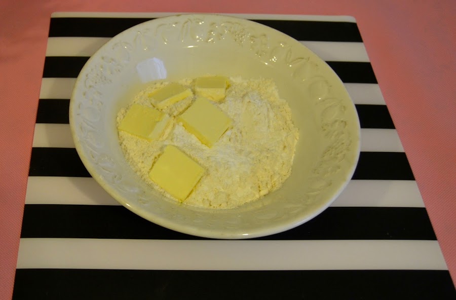 1 pizca de sal Para empezar hay que tamizar la harina con el polvo de hornear. Luego le agregamos la mantequilla cortada en cuadraditos.