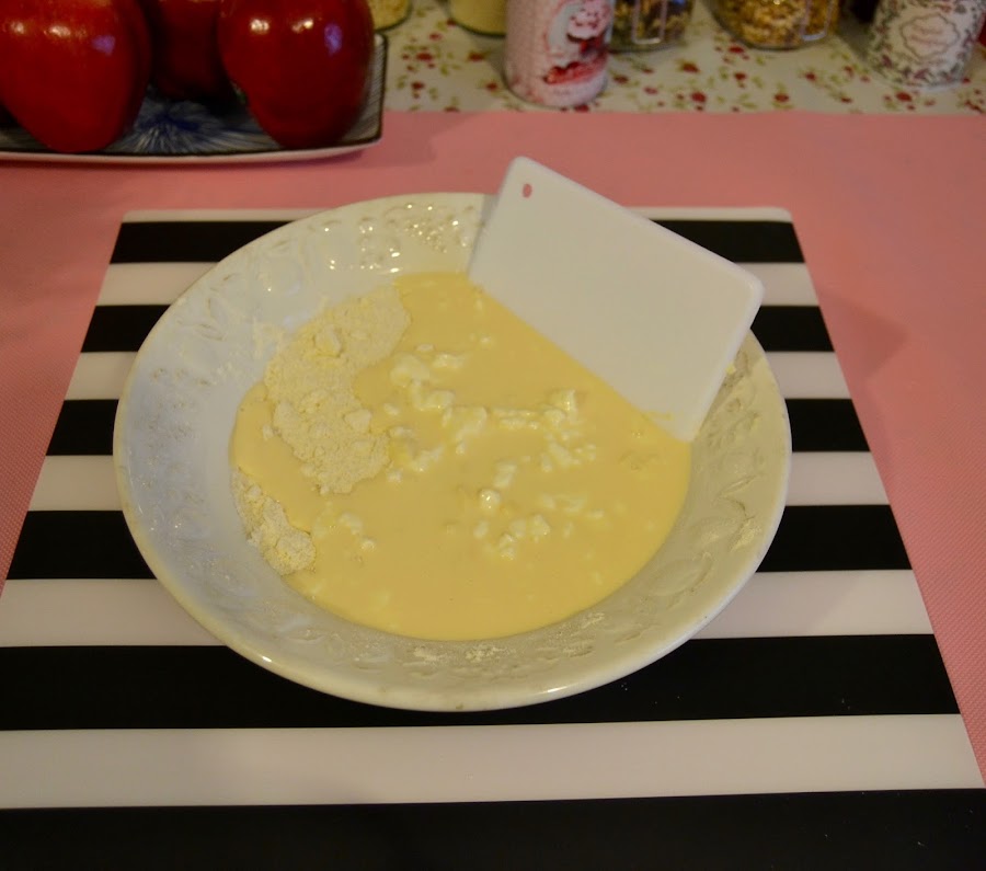 Ahora, vamos a juntar las dos partes. No hay que amasar, ni mezclar de mas. Asi que lo mejor es hacerlo con un cornet, o un tenedor. Tiene que quedar una mezcla pegajosa.