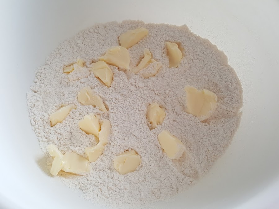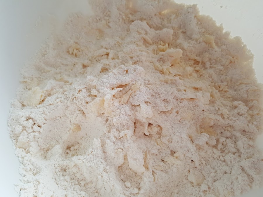 2. - Añadimos la mantequilla en trozos y con los dedos, la vamos desmenuzando, hasta que nos quede como pan rallado.