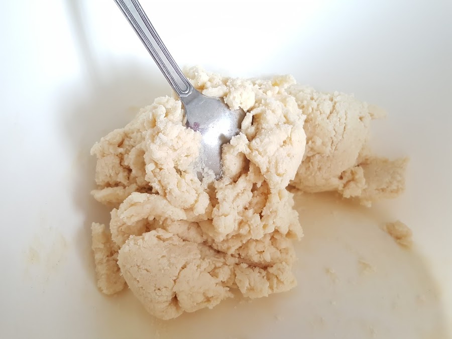 3. - Añadimos la leche y con ayuda de una cuchara, vamos removiendo hasta que se quede todo unido, pero no amasado como otras masas, simplemente hasta que se quede todo pegado a la cuchara.
