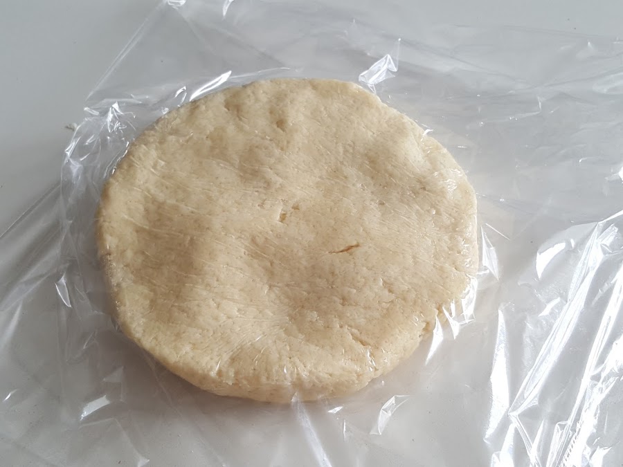 4. - Ponemos la mezcla sobre film transparente, y cubierto con más film, lo aplastamos un poco y lo metemos en la nevera una media hora.