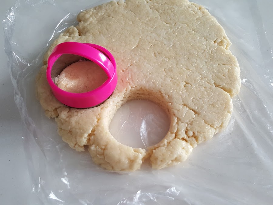 6. - Con un cortapastas, sacamos los scones, sin girarlos, para que suban bien. Y los colocamos sobre una fuente de horno con papel de hornear.