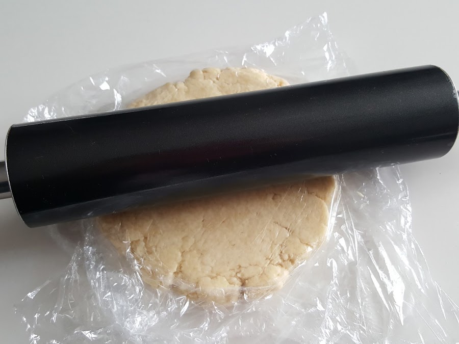 5. - Encendemos el horno a 200º y sacamos la masa de la nevera. Le pasamos un rodillo por encima, para dejarlo de un centímetro de espesor y dejarlo liso.