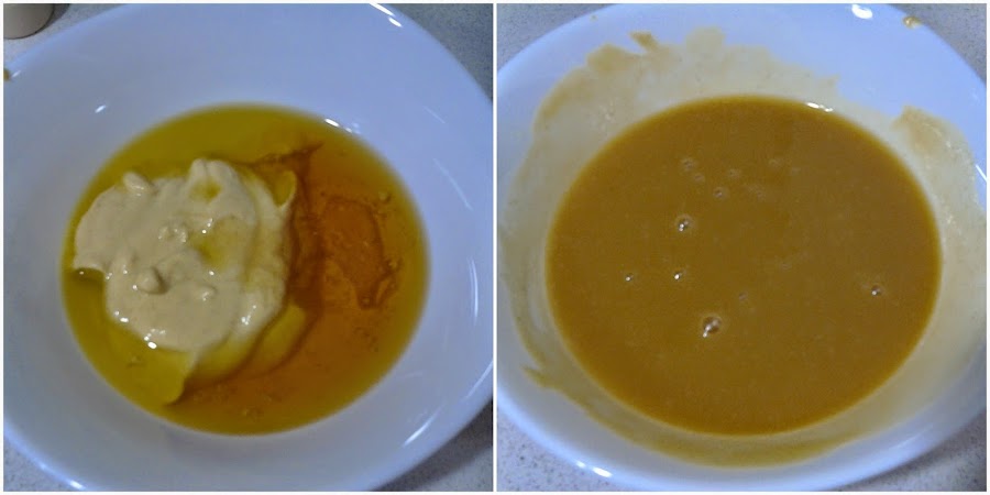 Para la salsa basta con que emulsionemos la mostaza con la miel y el aceite.