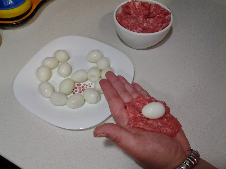 Una vez cocidos, dejamos enfriar bien y les quitamos la cáscara con cuidado de no romperlos. Cogemos una porción de carne, la estiramos y colocamos el huevo en el centro. Con cuidado cerramos para que quede cubierto por la carne. Así hasta tener todos los huevos listos.