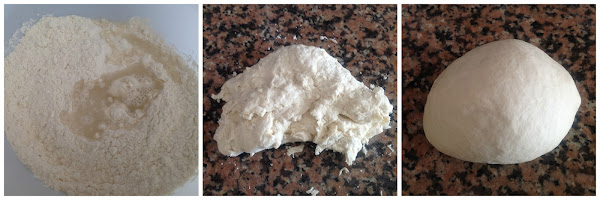 Ponemos en un bol la harina con la sal y añadios el agua integrando bien. Volcamos la mezcla en la encimera enharinada y amsamos hasta obtener una masa suave que no se pega a los dedos. Cubrimos con un paño y dejamos descansar 15 minutos.