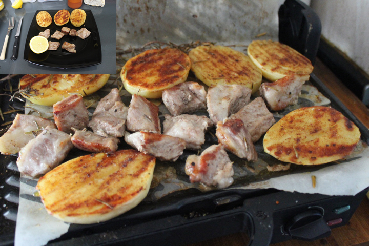 Últimamente utilizo mucho el grill doble, en esta ocasión, he unido un secreto de cerdo troceado, a unas patatas también asadas en el grill.