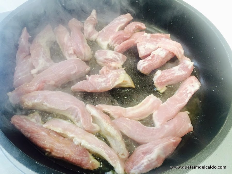 Incorporamos ahora las tiras de secreto que teníamos reservadas, tapamos la sartén y la dejamos cocinándose durante 6 minutos.