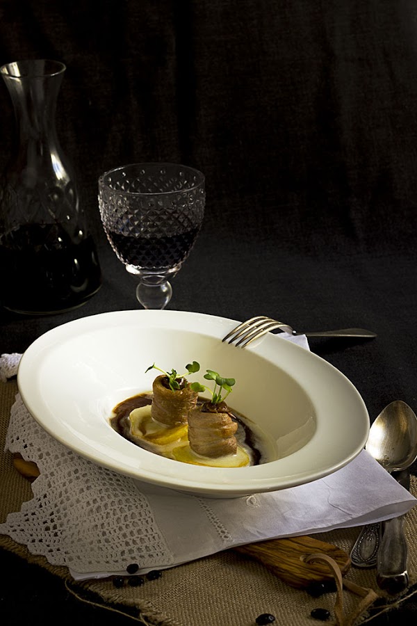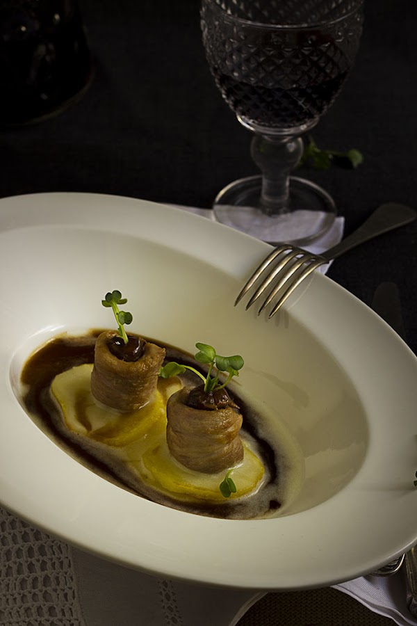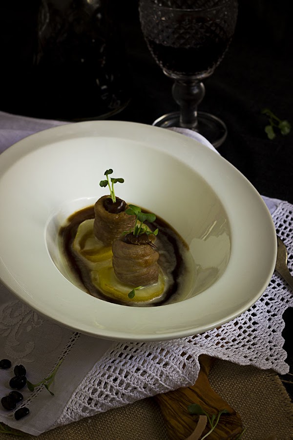 Presentamos los rollitos sobre una base de patata confitada, añadimos por encima la salsa de café y el puré trufado. Decoramos con algún brote.