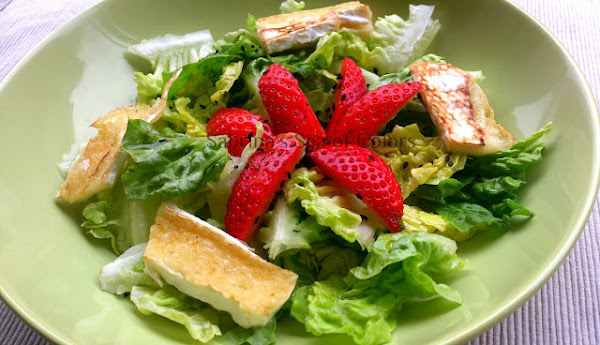 Ensalada griega, ensalada de fresas y brie y ensalada de salmón y aguacate