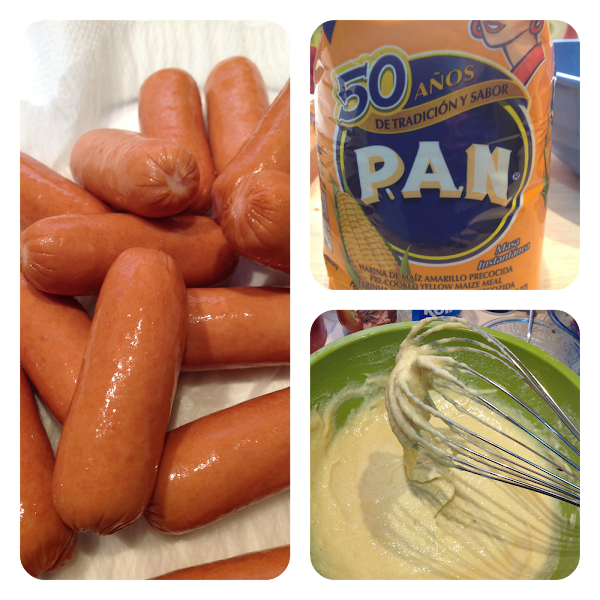 Vertemos la masa en un vaso alto, de tubo. Cogemos las salchichas por el palillo y vamos metiéndolas de una en una en la masa hasta que quede cubierta por completo. (Este paso me ha recordado a los cake pops y lo regular que se me dan).