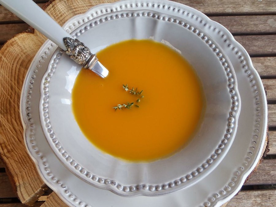 Necesitaréis zanahorias, naranja, tomillo, caldo de pollo, aceite de oliva.... Se prepara un sofrito con las zanahorias, el tomillo y la ralladura de naranja. Luego se agrega el caldo y el zumo de naranja, se condimenta y se deja que enfríe bien antes de servir.