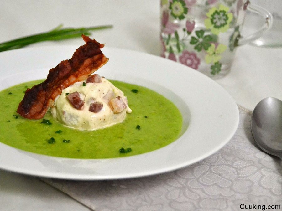 Puedes ver el paso a paso de la receta y las cantidades pinchando aquí: crema de guisantes con helado de bacon.