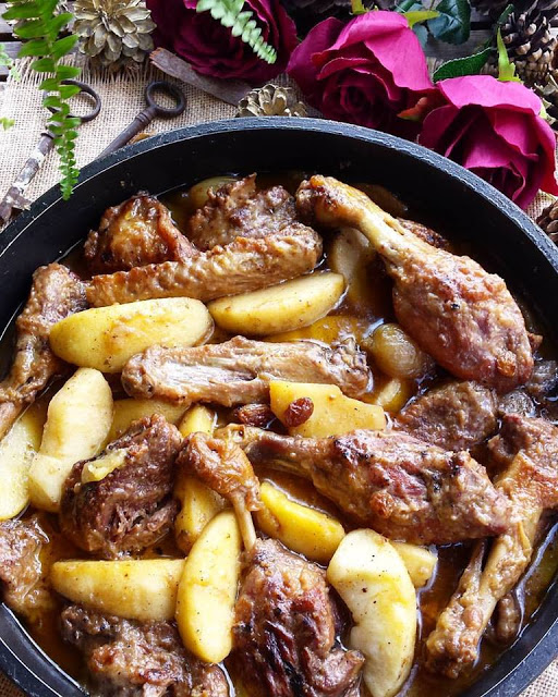 Puedes ver la receta completa pinchando aquí: pato rustido con manzanas, pasas y ron.