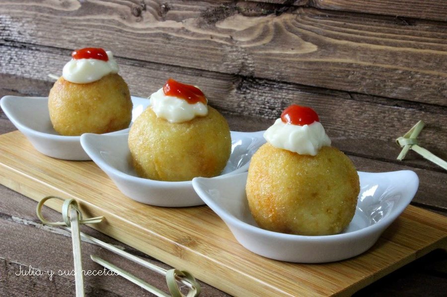 Es necesario preparar un puré con patatas, queso, huevos.... Luego se forman bolitas con el puré, y su interior se rellena con chorizo frito. Finalmente se impreganan las bolitas de un rebozado crujiente, se fríen y se decoran. Muy ricas, ¿verdad?
