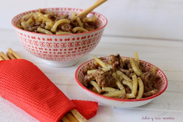 Continuamos con otra receta de supervivencia para estudiantes que me he traído del blog Julia y sus Recetas. Se trata de unos fideos con carne que están buenísimos y que tienen un toque oriental que tanto gusta a los jóvenes.
