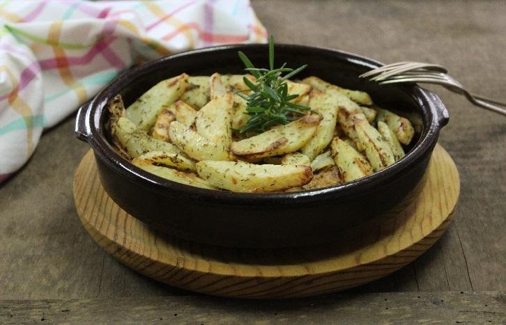Tendremos que pelar y cortar las patatas en gajos. Luego, se aliñan con aceite, vino blanco, hierbas provenzales.... Se colocan en la bandeja del horno y se asan hasta que estén tiernas.