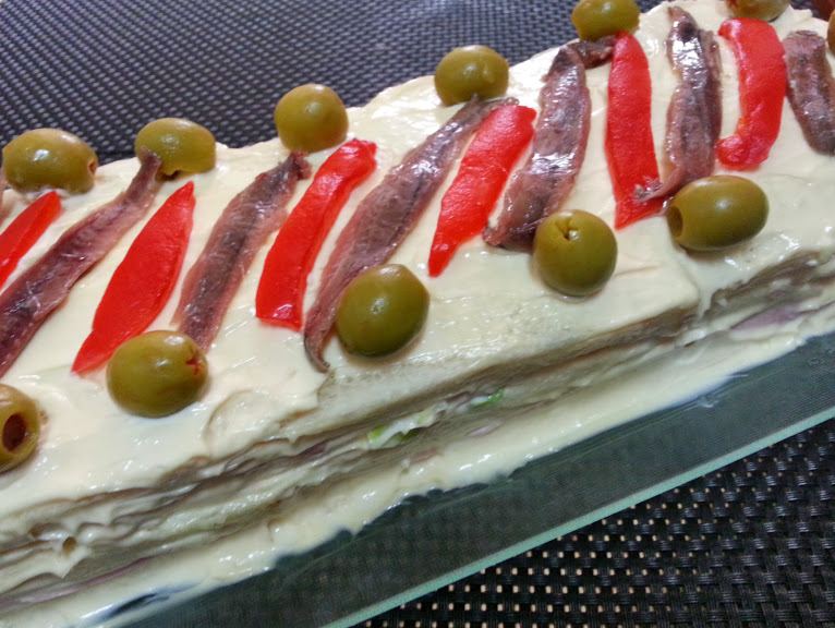 Tapamos con las tres útimas rebanadas de pan y cubrimos todo el pastel con mayonesa. Finalmente, adornamos con las anchoas, el pimiento rojo cortado en tiras y las aceitunas.