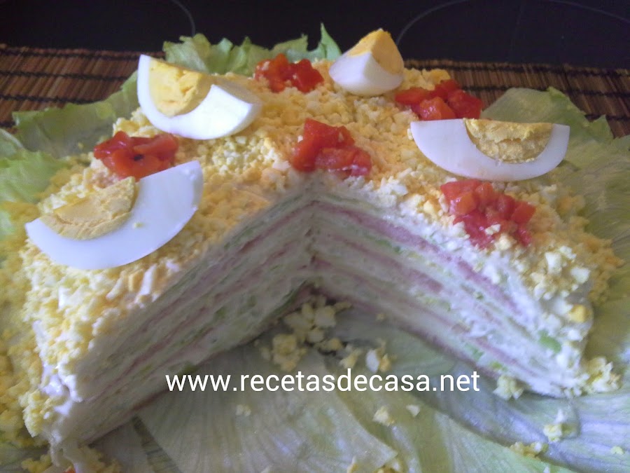 Coronamos la superficie con el pimiento rojo y dos huevos cortados. Puedes verlos con fotos paso a paso en el siguiente enlace: PASTEL DE TORTITAS DE TRIGO