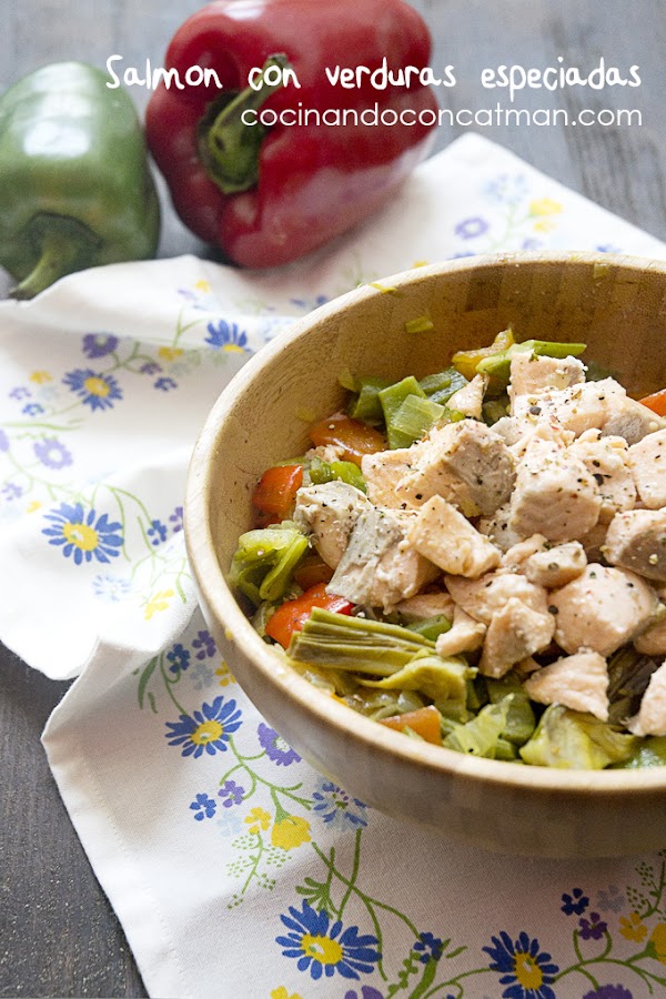 La siguente receta nos llega desde el blog Cocinando con CatMan, y como a los gatos lo que más les gusta es el pescado (eso dicen...) su propuesta es un maravilloso salmón con verduras especiadas. Un plato, en palabras de su autor; "de chuparse las zarpas".