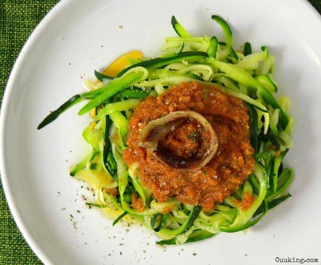 El siguiente plato es del blog Cuuking!, nos enseña cómo preparar una salsa de pesto rosso y nos regala una receta completa en la que utiliza esta salsa para acompañar unos deliciosos espaguetis de calabacín.