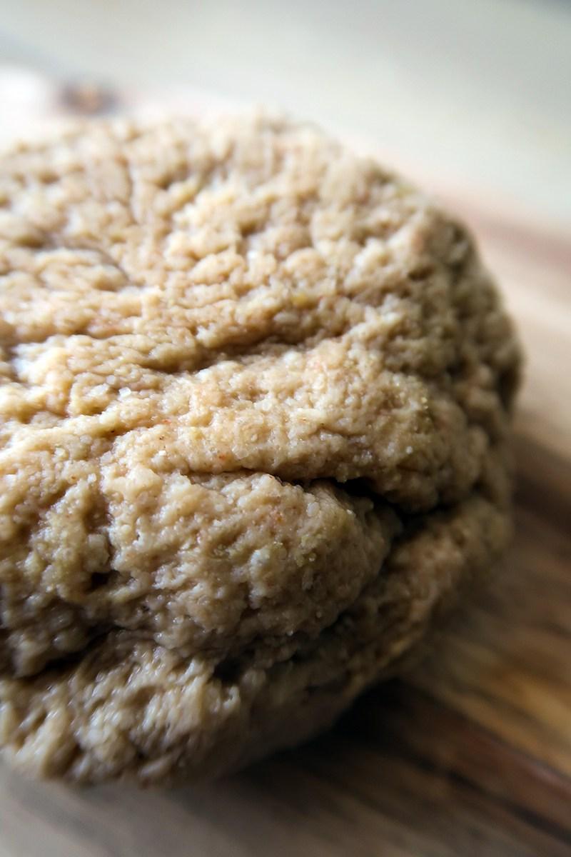 Partir la bola de seitán en dos con cuidado y volver a dar forma de bolitas.