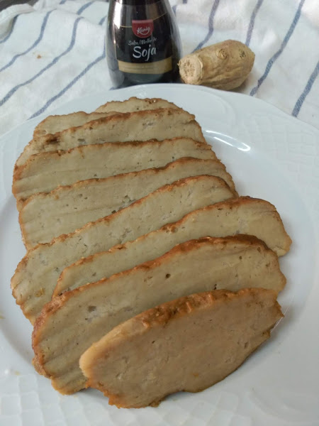 5.- Añade la salsa de soja, el alga kombu y el agua. Introduce el cestillo con el seitan crudo. Situa el recipiente varoma en su posicion sin taparlo para que evapore sin salpicar. Programa 40 min/vel.2/100º. Cuando termine saca el cestillo con el seitan. Deja enfriar y utiliza a tu conveniencia.