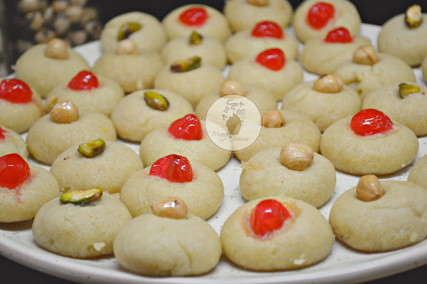 Para hacerlos mezclamos los ingredientes secos (Harina, azúcar, bicarbonato, sémola) y hacemos un agujero en el centro y allí agregamos la mantequilla pomada,el huevo y mezclamos todo hasta lograr una masa uniforme, que se pueda manipular y hacer unas pelotitas pequeñas y las coronamos con algún fruto seco, avellanas, o pistachos.
