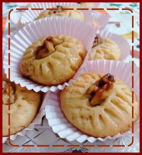 Presionamos un poco y le incrustamos un fruto seco en el centro, yo les puse una nuez. Puedes poner el que quieras o combinar varios, unas galletas de almendras, otras de pistachos, otras de avellanas...