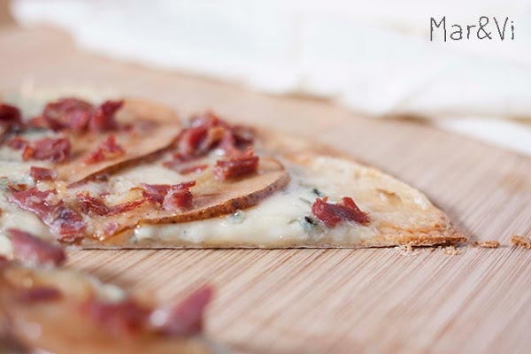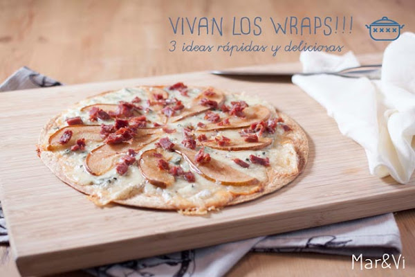 Ponemos un wraps sobre una bandeja de horno y colocamos encima: queso gorgonzola en tiras, queso emmental rayado, rodajas de pera (cortaremos las peras a lo largo con cáscara y bien lavadas, en rodajas lo más finas posibles) y daditos pequeños de jamón. Metemos nuestra pizza en el horno durante 5-7 minutos (hasta que el queso este bien derretido) retiramos y condimentamos con un poco de pimienta y sal Maldon antes de servir. ¡Exquisitas!