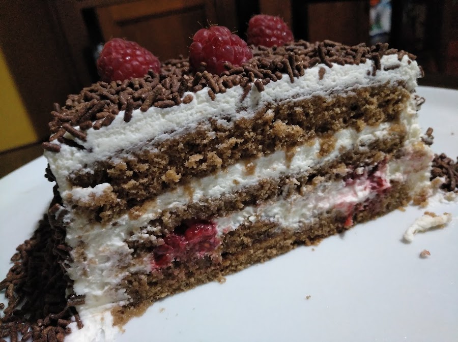Finalmente, colocar otra capa de bizcocho, empapar y cubrir con nata (crema de leche) por arriba y por los laterales.