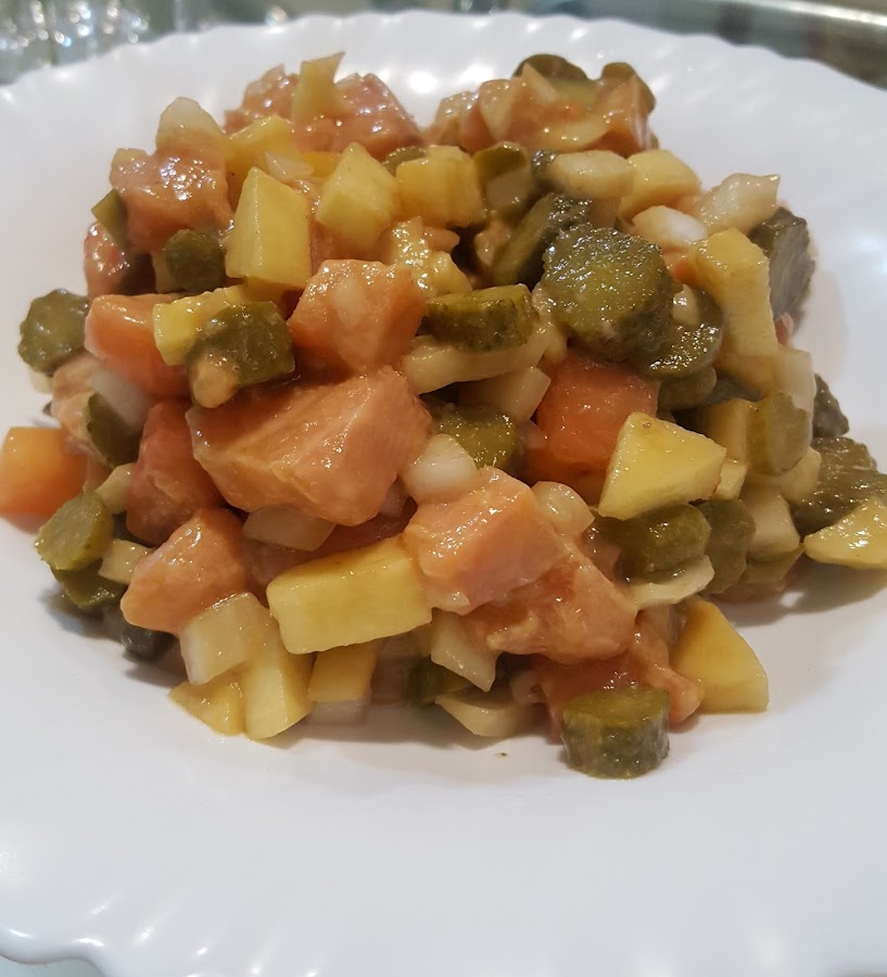 Es el momento de incorporar la vinagreta a nuestro semi-ceviche y remover con muchísimo cuidado para no romper el salmón que habrá cambiado un poco de color volviéndose ligeramente más pálido.