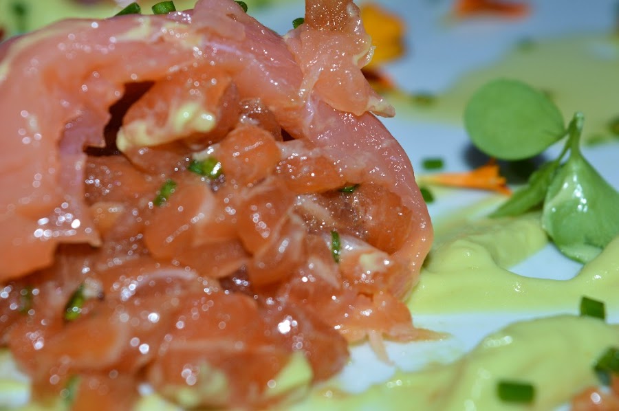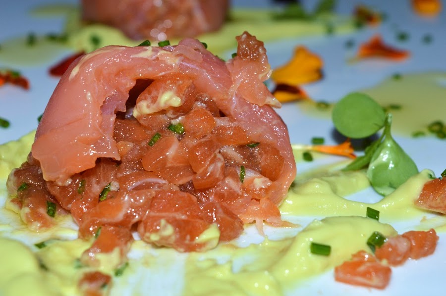 Mi receta son unas esferas hechas con lonchas muy finas de salmón ahumado, rellenas de un tártaro de salmón y con una crema de aguacate. Bon profit!!!