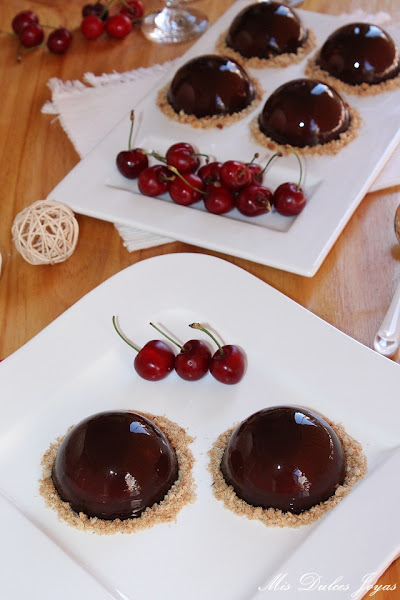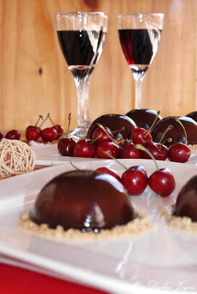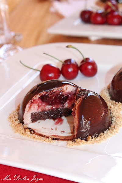 Como estamos en temporada de cerezas, el otro día se me ocurrió preparar estas semiesferas de mousse de cereza, con corazón de confitura de cereza (casera), base de bizcocho de chocolate emborrachado de almíbar al kirsch y glaseado de chocolate brillante.