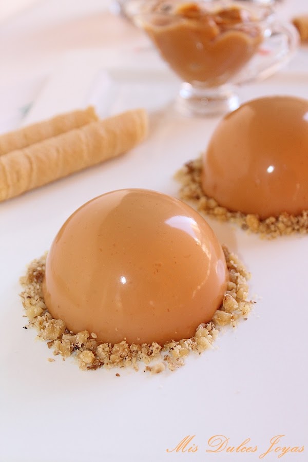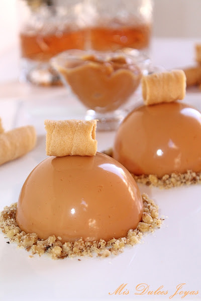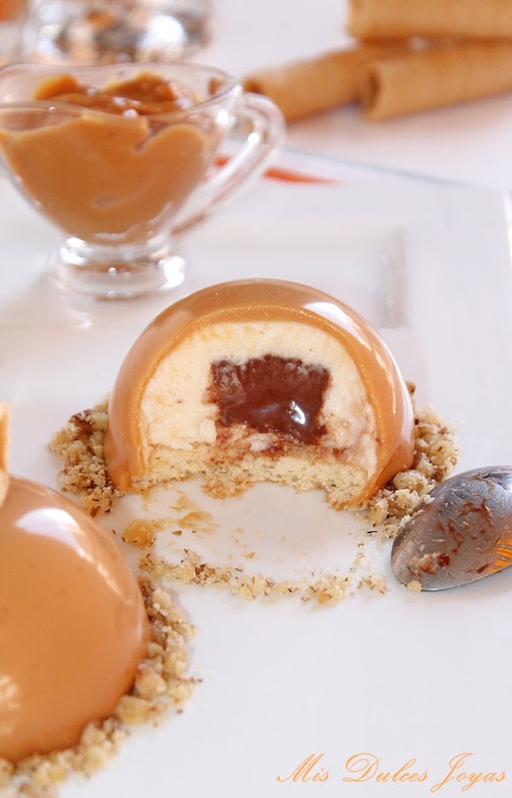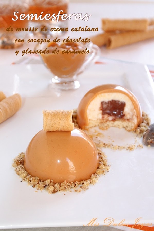 Semiesferas de mousse de crema catalana con corazón de chocolate y glaseado de caramelo