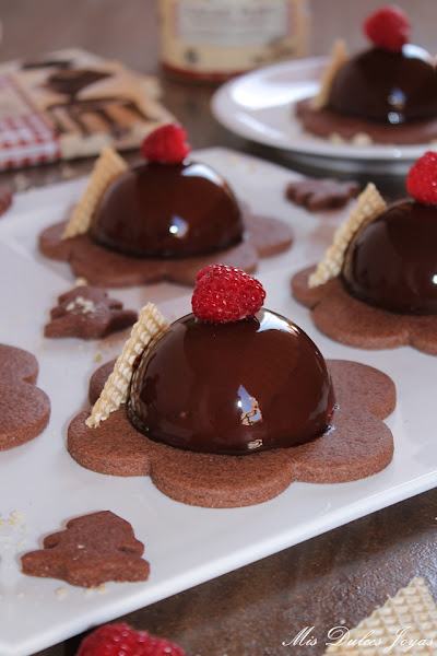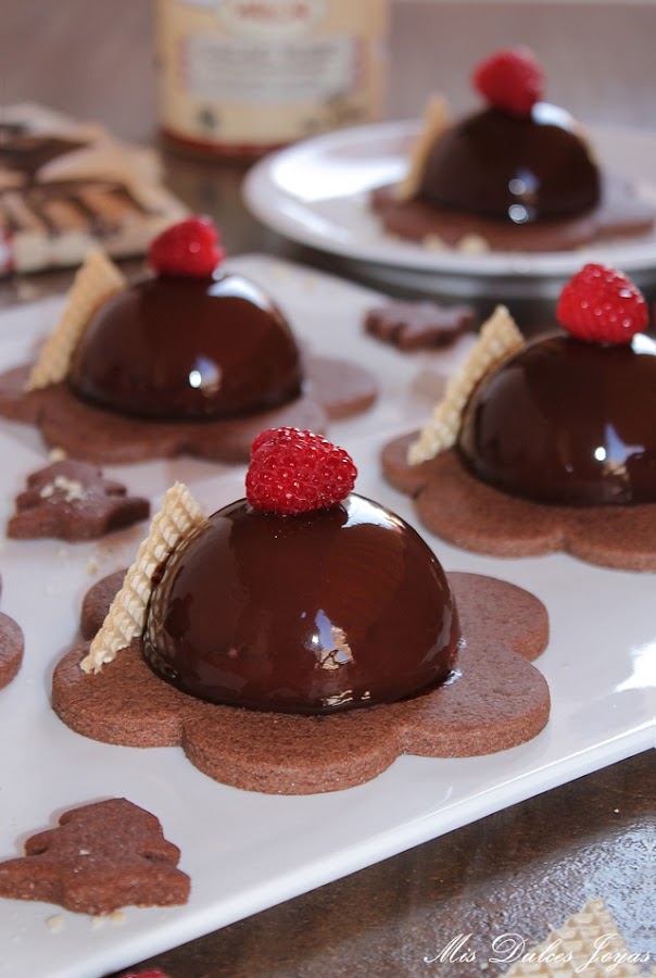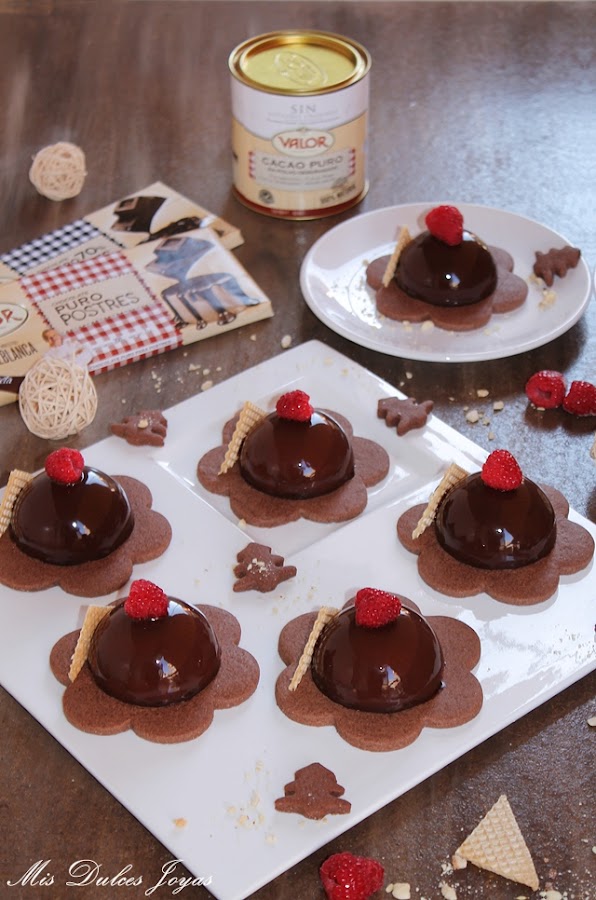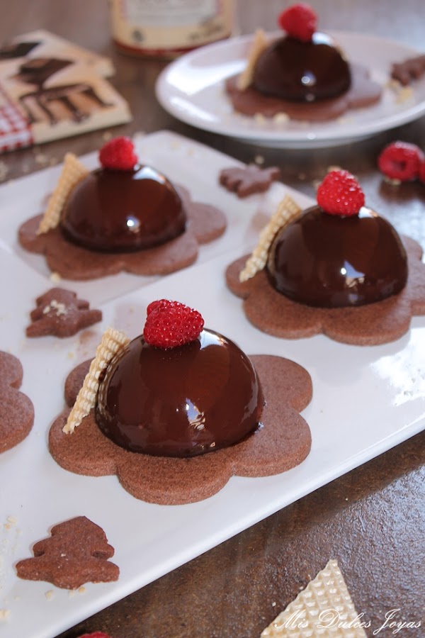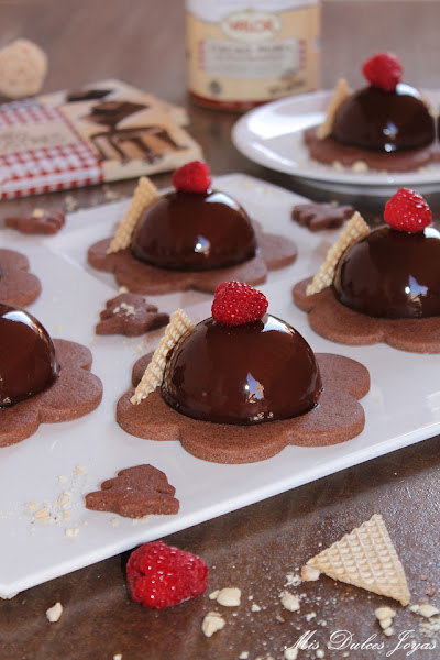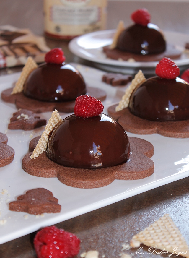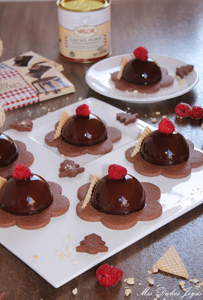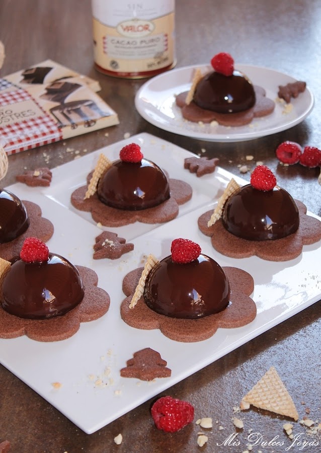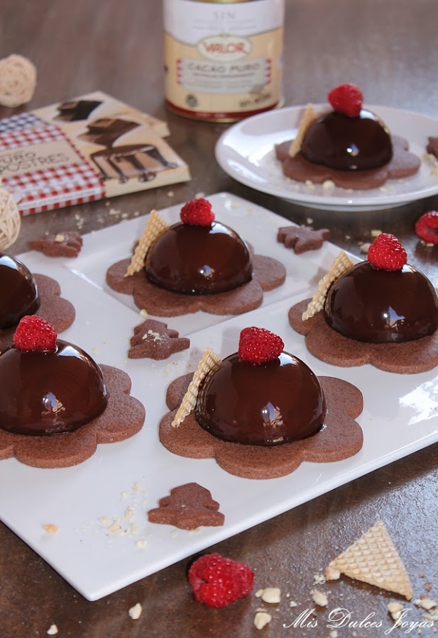 Si os da pereza preparar las sablée de chocolate siempre podéis presentar las semiesferas sobre una cama de galletas o bizcocho tipo brownie, recortado con un cortador de galletas de la forma deseada. Si os cuesta encontrar frambuesas, las podéis sustituir por fresas u otro fruto rojo.