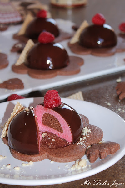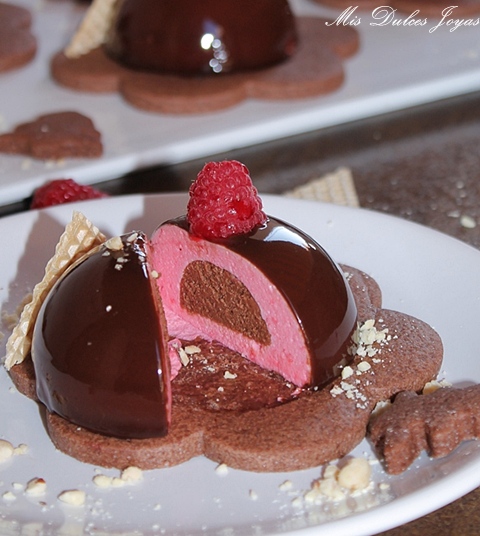 Semiesferas de mousse de frambuesa con corazón de chocolate, sablée de chocolate y glaseado de chocolate brillante