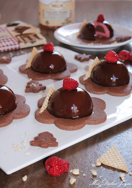 Hola, hola !!! Esta semana vengo con otra receta más. Os traigo unas semiesferas de mousse de frambuesa con corazón de chocolate, divertidas y riquísimas. Presentadas sobre una sablée de chocolate con forma de flor y glaseadas con un glaseado de chocolate brillante. Una delicia para el paladar !!!!