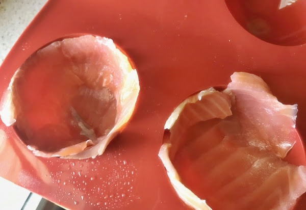 *Rellenamos con las laminas de salmón el fondo de cada semiesfera. Recorta bien .Meter en la nevera