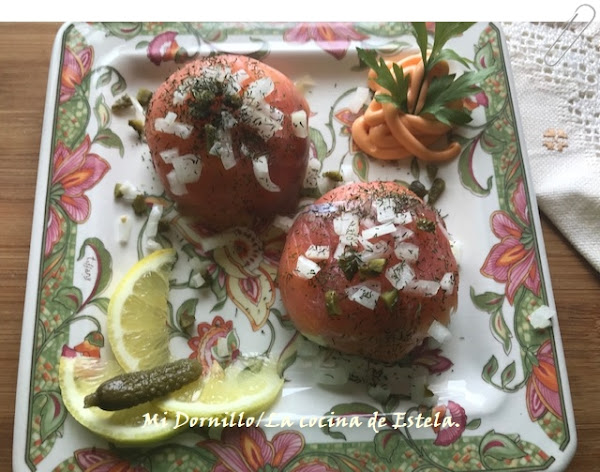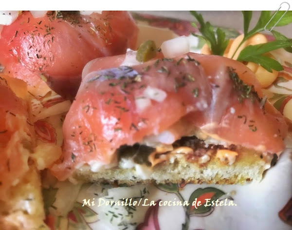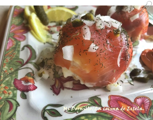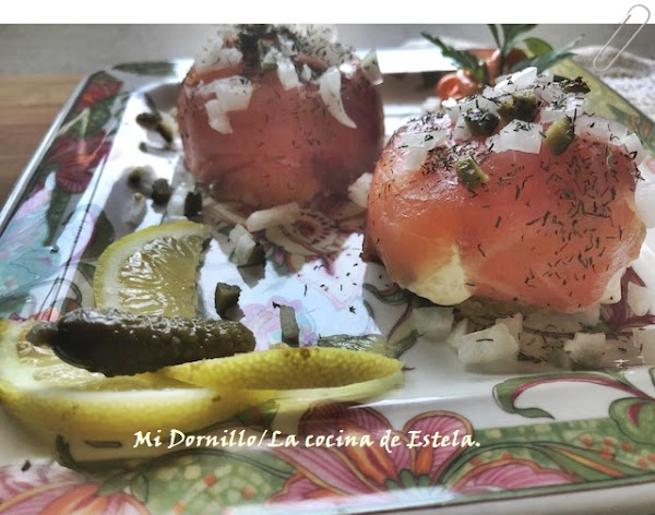 El ingrediente del reto de este mes,"Tus recetas", es el salmón ahumado y se me ocurrió estas semiesferas, que yo he rellenado de una ensaladilla de pepinillos con patatas y algo mas. Pero desde luego podéis rellenar estas semiesferas de los que mas os guste.