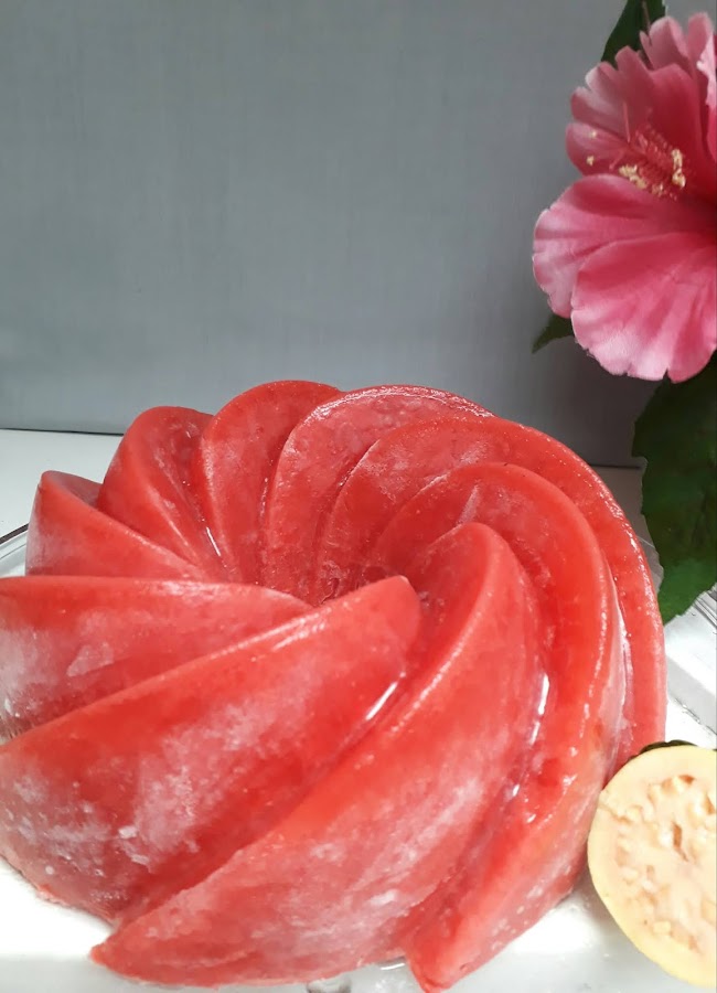 Licuar leches,mermelada,vainilla,sal y gotas de colorante rojo,luego agregar la gelatina disuelta volver a licuar bien,verter a un molde de chimenea mediano ligeramente engrasado,cubrir con plástico de cocina y refrigerar una 4 a 6 horas mínimo antes desmoldar y servir.