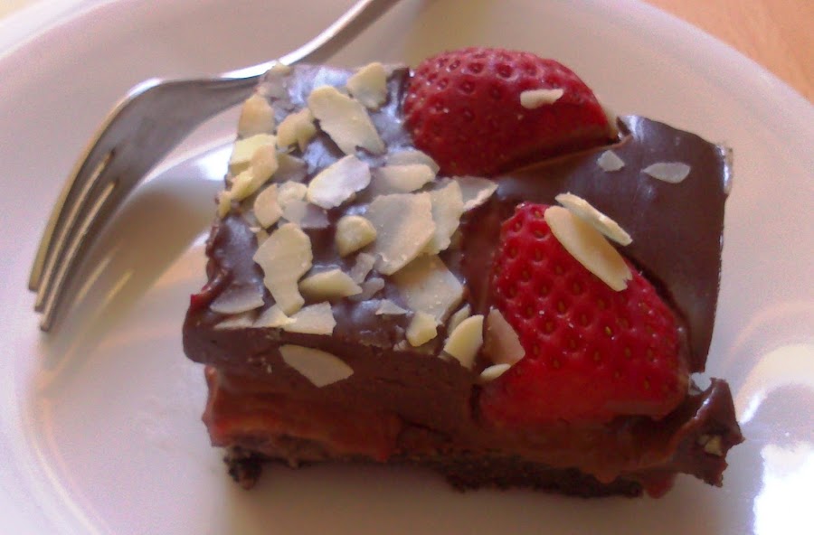 Decoramos con las fresas y espolvoreamos con las almendras. Lo dejamos en la nevera al menos 2 horas antes de servir y cuando vayamos a comerlo tendremos la precaución de sacarlo de la nevera unos 10 minutos antes así no estará tan frío.